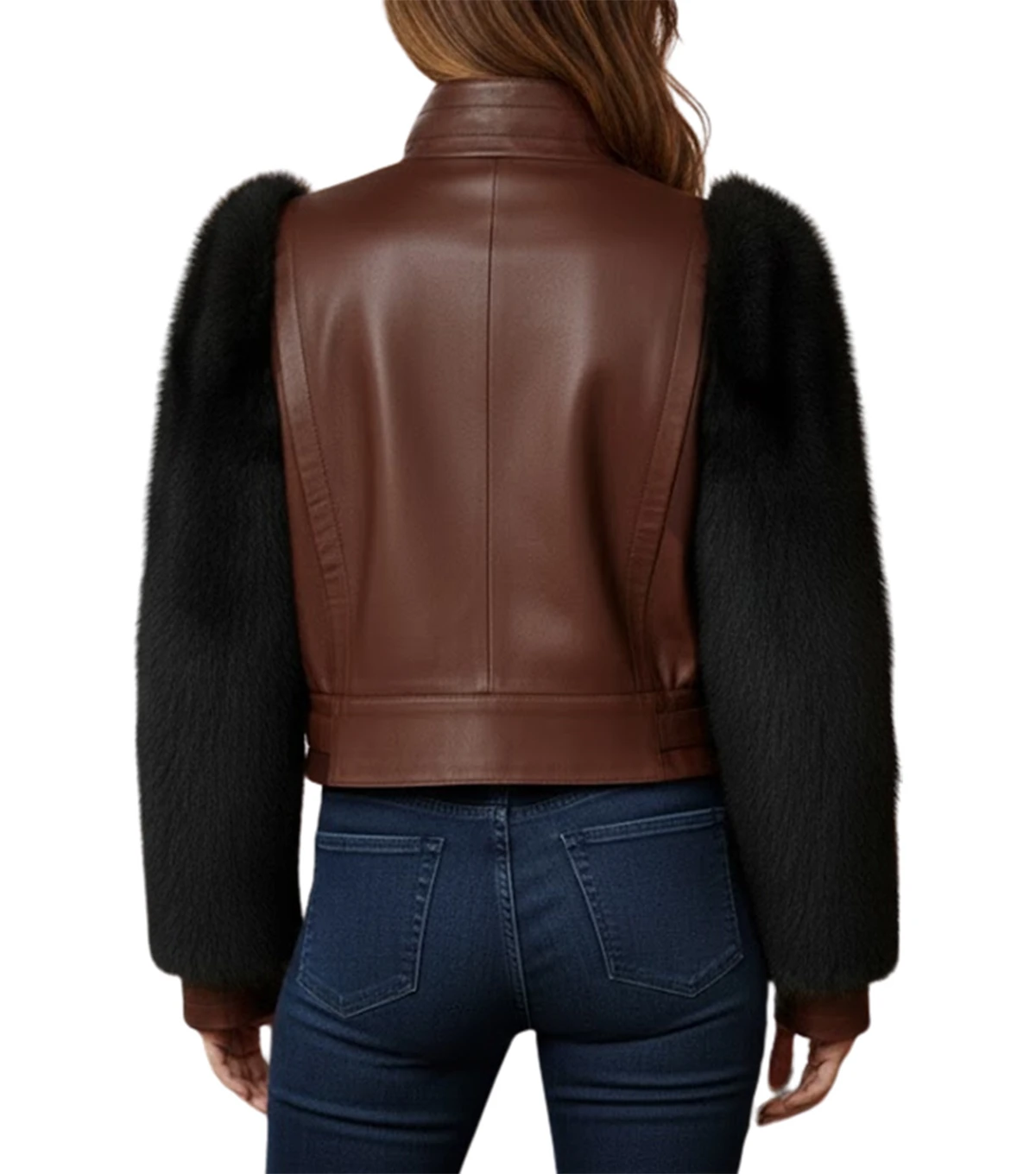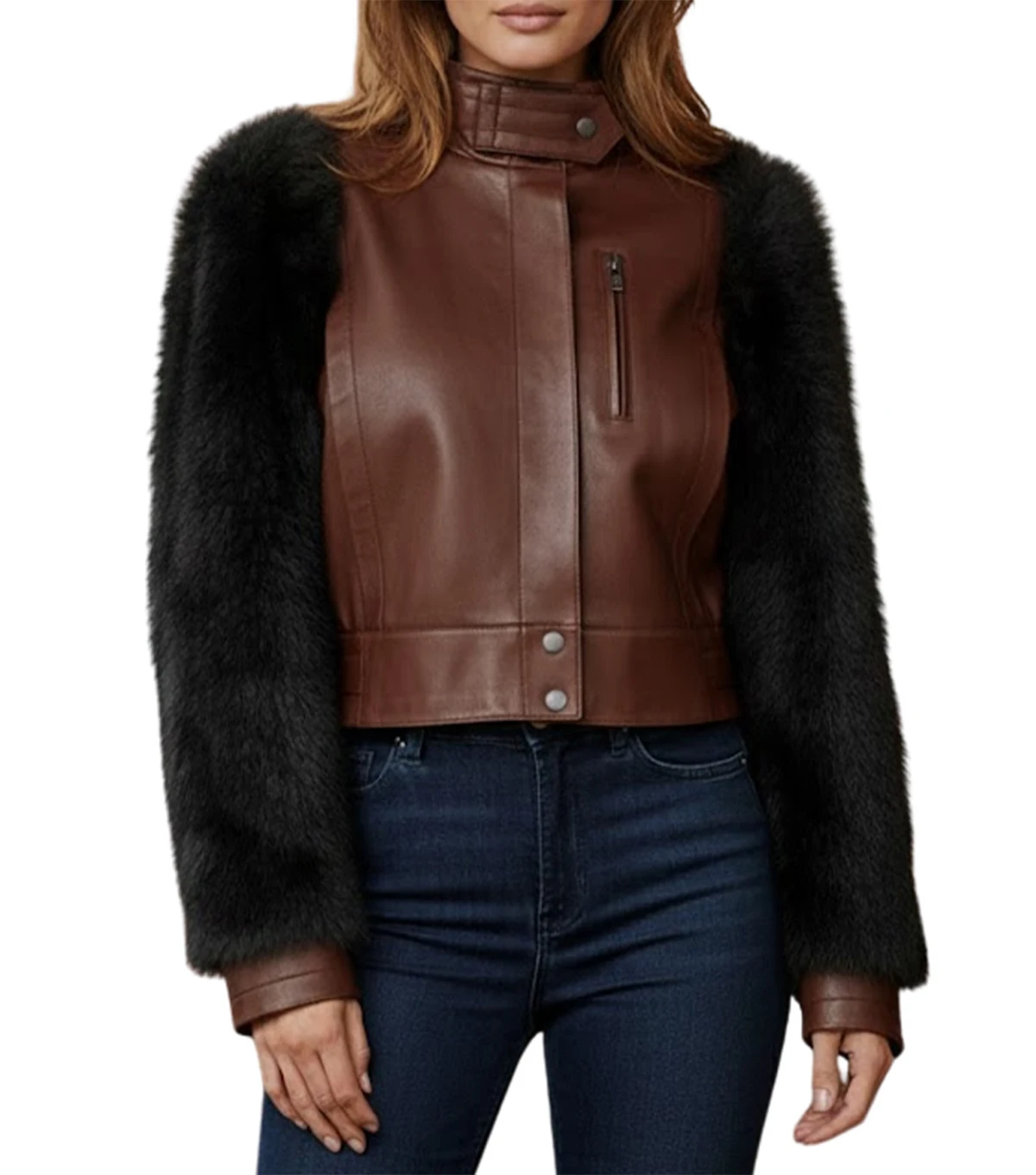 Brown Leather Black Fur Sleeve Women’s Jacket