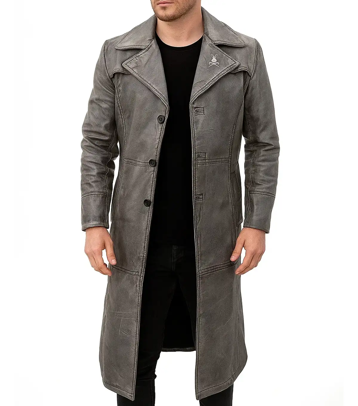 Shop Distressed Grey and Black Leather Long Length Coat on Sale
