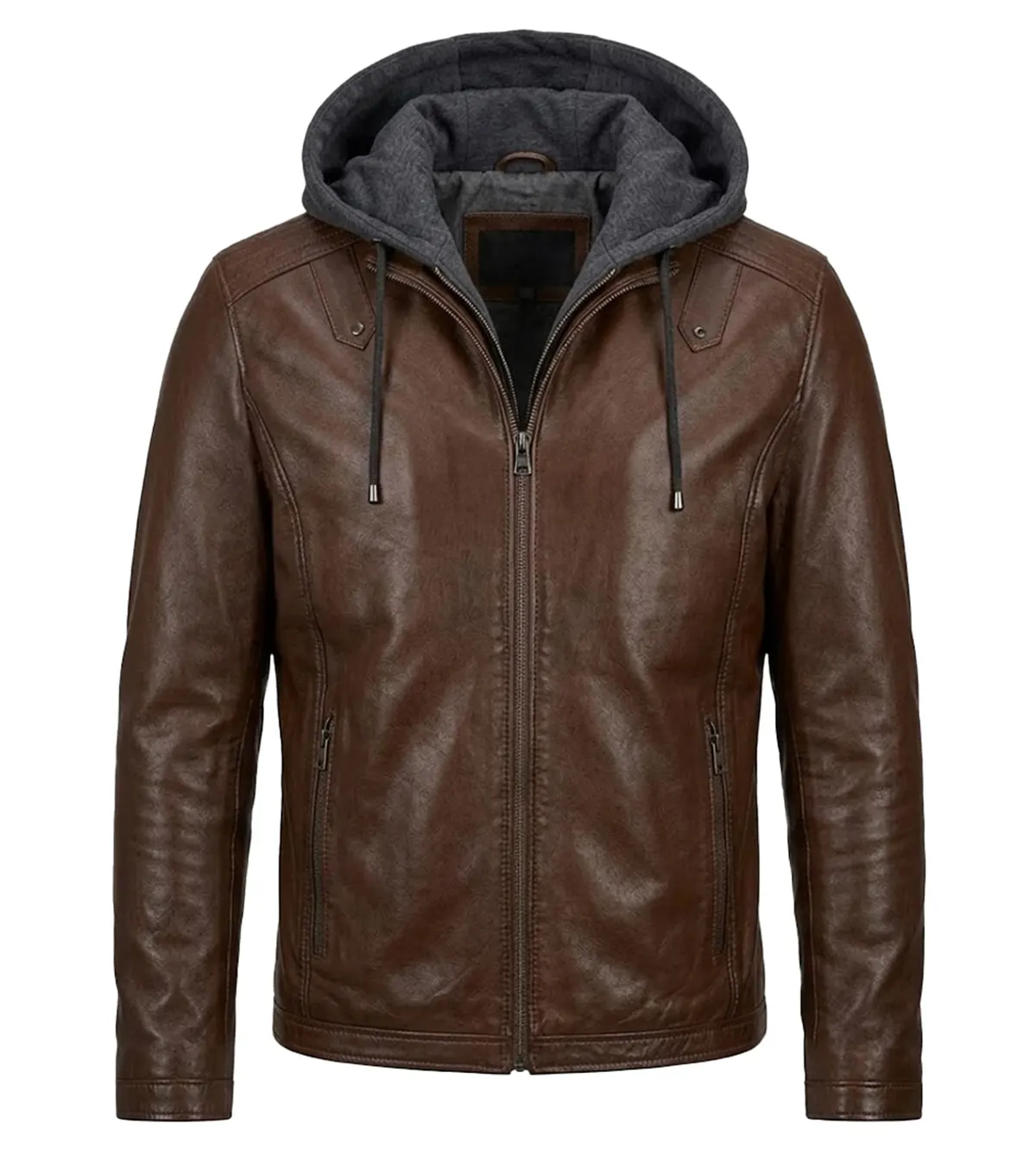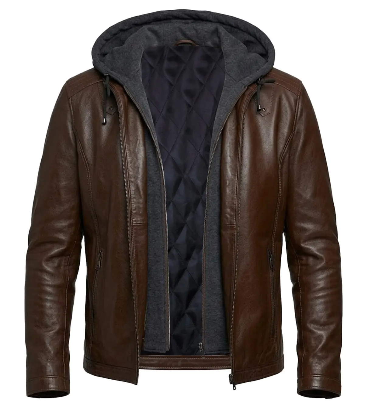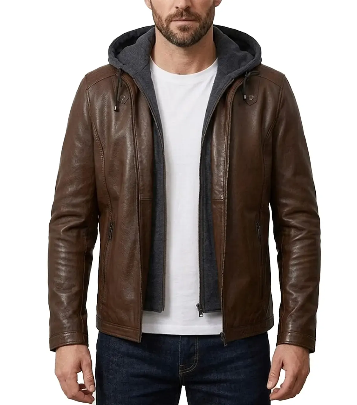 Shop Mens Brown Detachable Hooded Leather Jacket with Removable Fleece Hood
