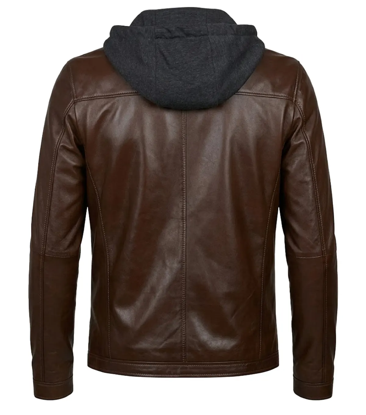 Mens Brown Detachable Grey Hooded Leather Jacket