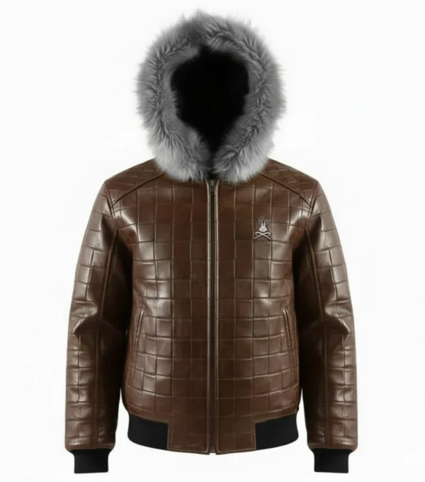Men’s Brown Quilted Leather Fur Hood Jacket Front