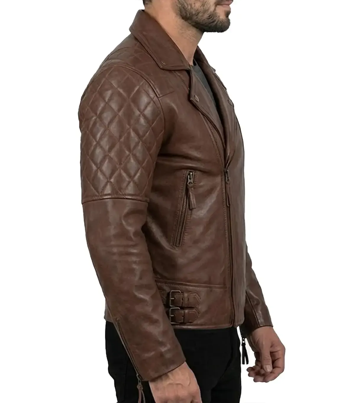 This jacket is real leather, so right when you put it on, it feels solid. Not cheap or flimsy at all. Inside is soft polyester lining, which actually makes a difference because you don’t get that scratchy feeling you sometimes get with leather jackets. The asymmetrical YKK zipper in the front looks stylish and also keeps it snug when you zip it up. Lapel collar gives it that biker jacket feel, and yeah, it looks like something you’d see in movies. The Brown Quilted Shoulder Motorcycle Jacket completes the look perfectly.