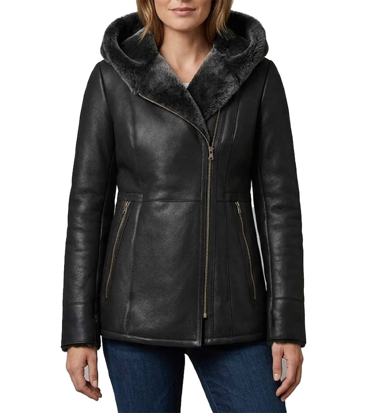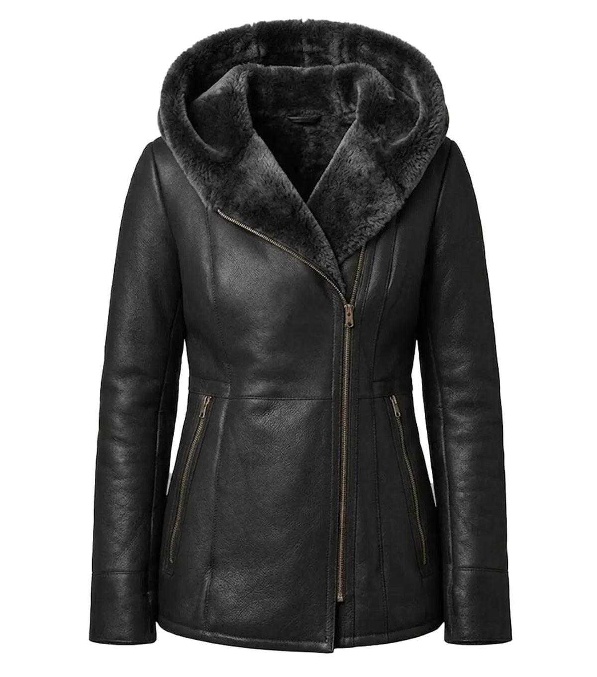 Shop Womens Black Shearling Hooded Long Leather Jacket with Fur Lined Hood