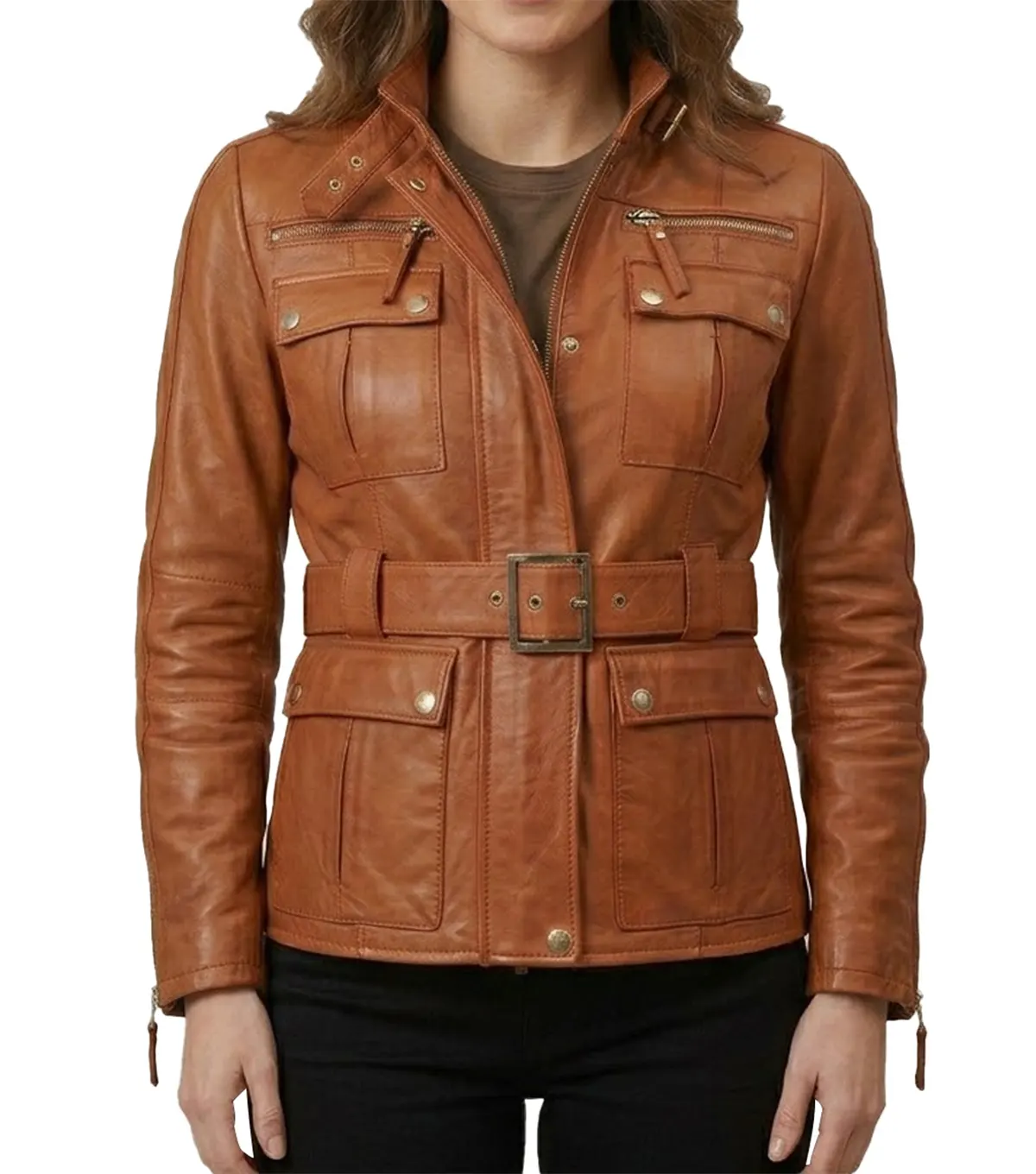 What stands out here is the multi-pocket design, but it doesn’t feel messy or overdone. Everything kinda sits where it should. The stand collar with a belt gives it that structured biker feel, while the center front zipper and adjustable waist belt pull everything together. It’s not exactly like a Women Burgundy Biker Leather Jacket, but you can see a bit of that influence, just more practical, less minimal. It feels like something made for actual wear, not just for looks.